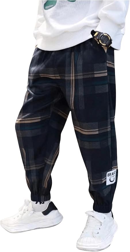 Boy's Casual Plaid Pants Elastic High Waist Joggers Pants with Pockets